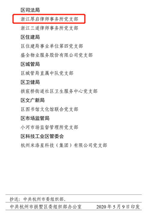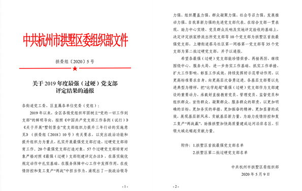 厚启讯:5月9日,中共杭州市拱墅区委组织部发布《关于 2019 年度最强(过硬)党支部评定结果的通报》(拱委组〔2020〕5号),公布了拱墅区首批最强党支部和第二批过硬党支部名单。厚启党支部因扎实的党建工作获得过硬党支部称号。